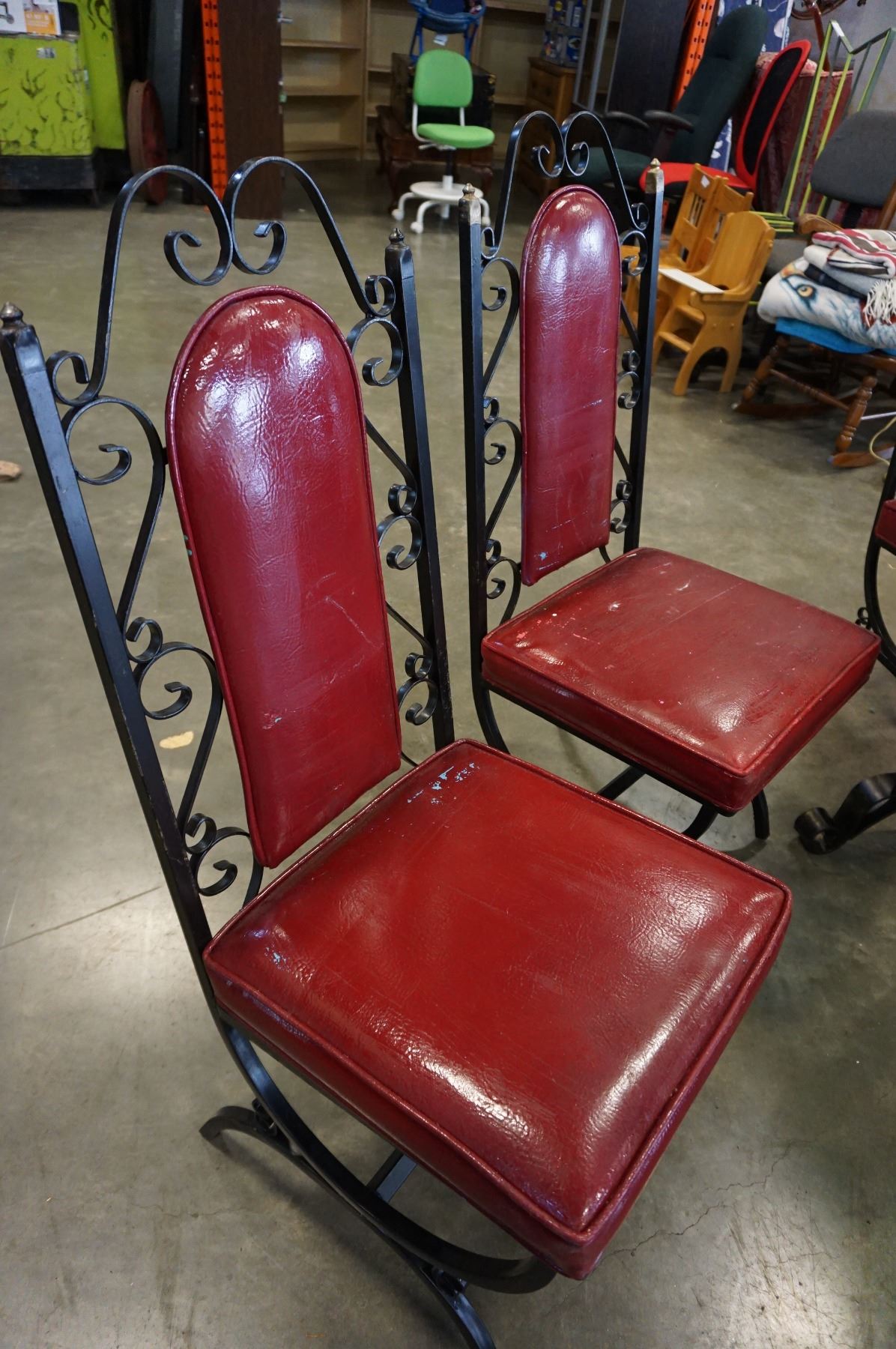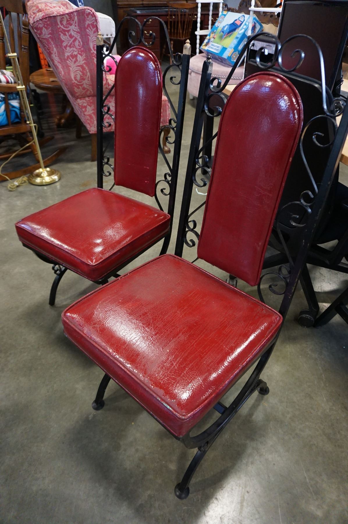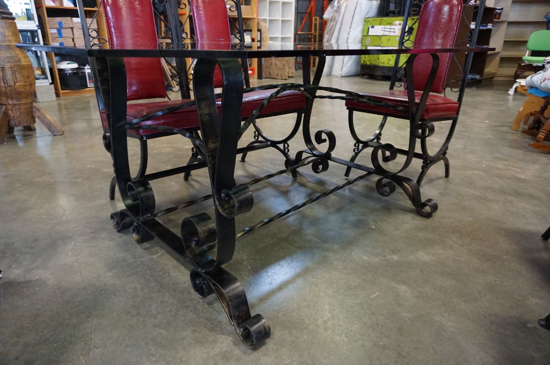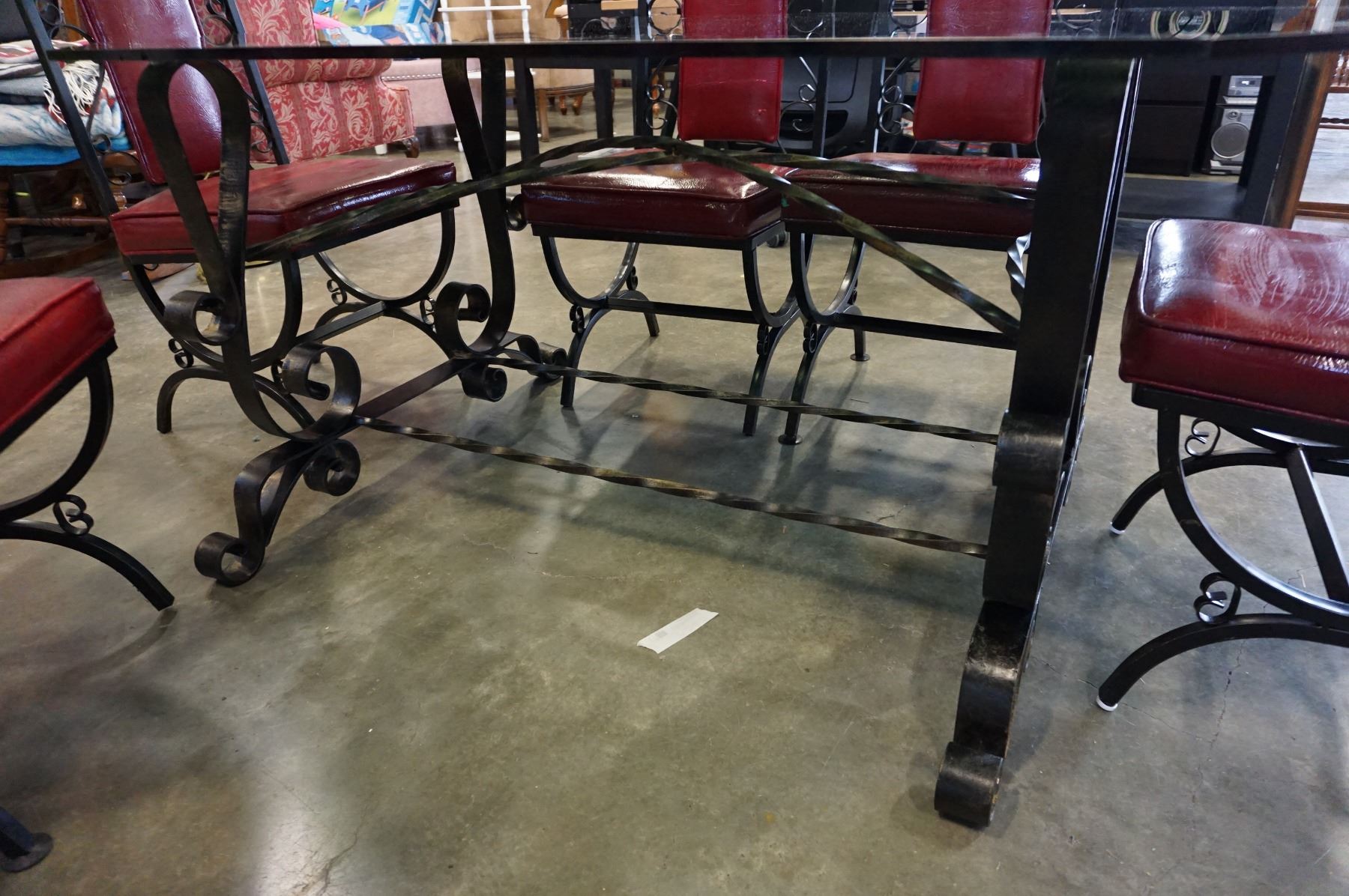 WROUGHT IRON TABLE WITH GLASS AND 6 CHAIRS