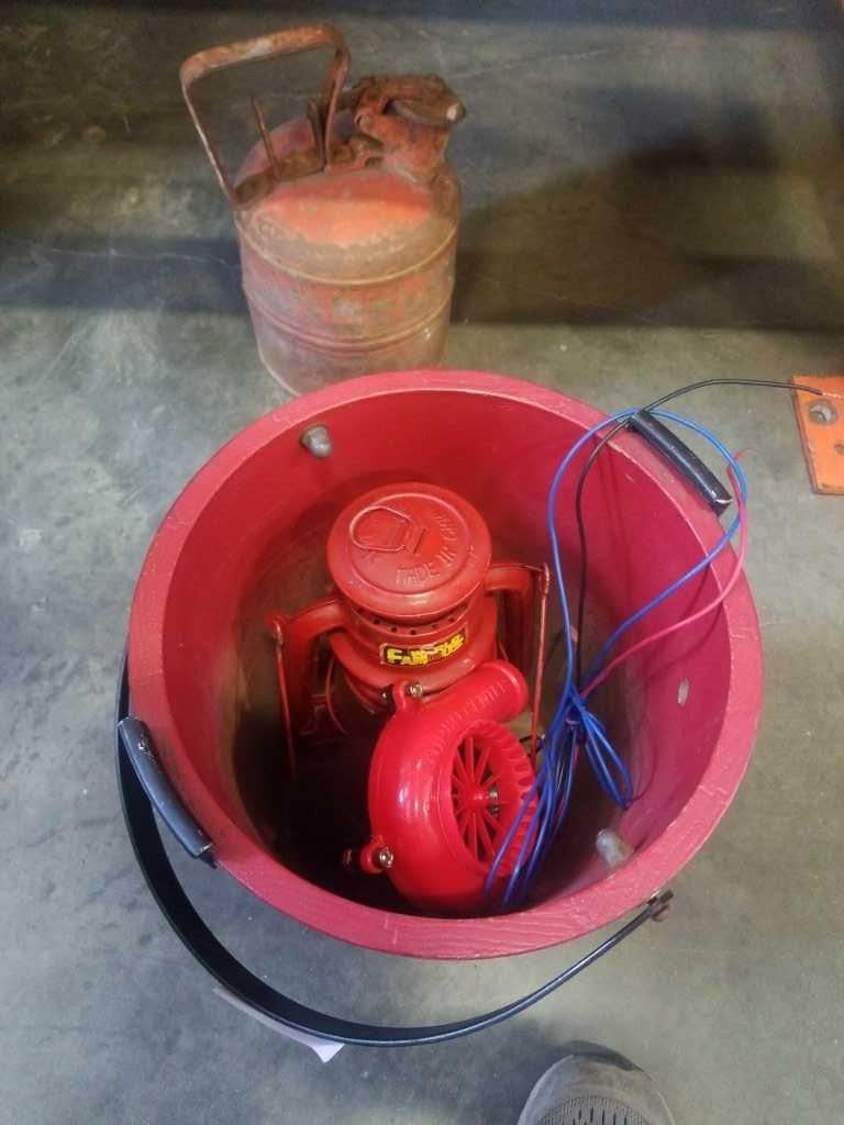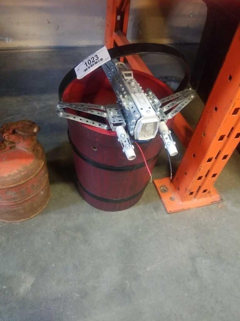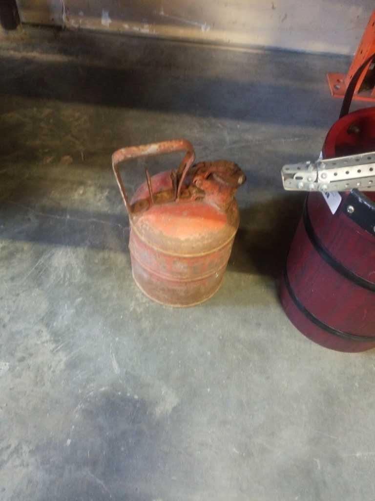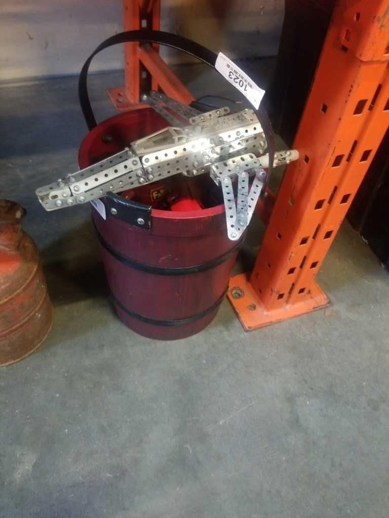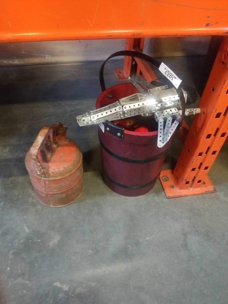 Wood bucket with lantern, vintage metal water jug, prototype plane and pump