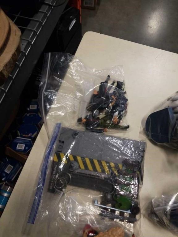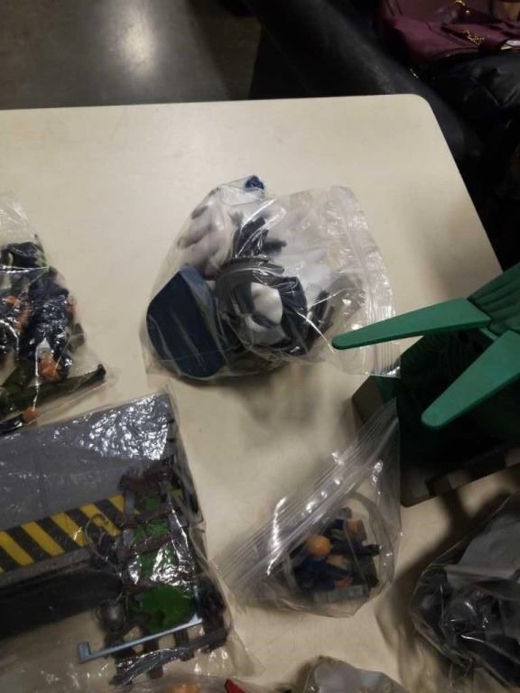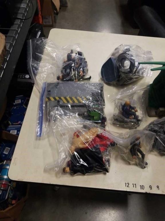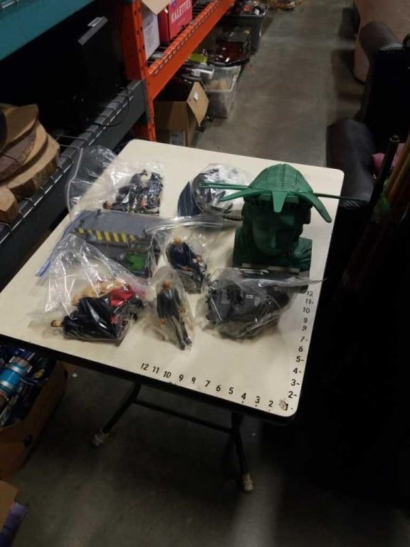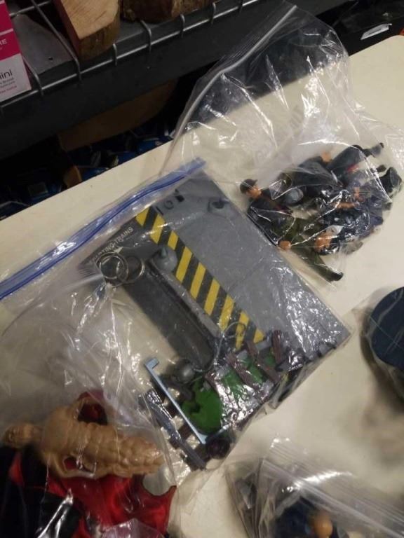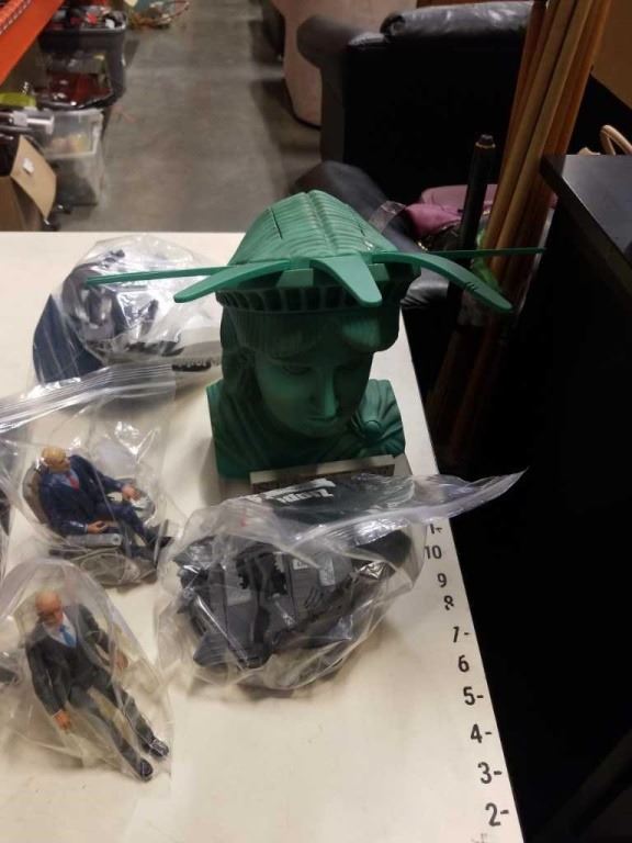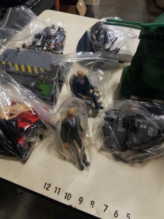 X-MEN STATUE OF LIBERTY AND 3 BAGS OF X-MEN ACCESSORIES AND 10 X-MEN FIGURES 2 W/ WHEEL CHAIRS