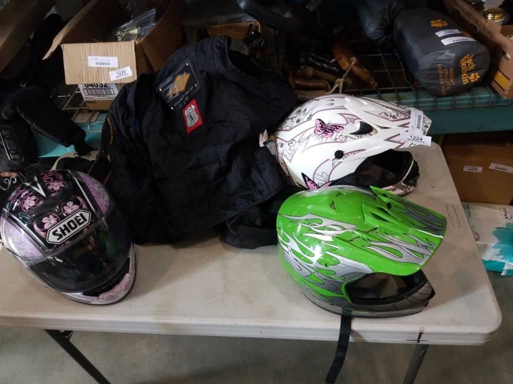 XS Power trip padded motorcycle jacket and three motorcycle helmets