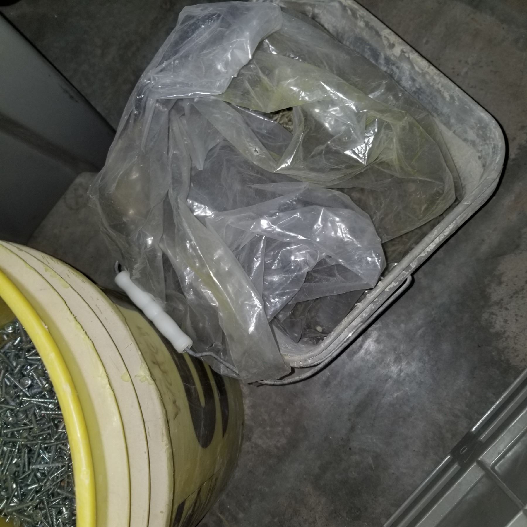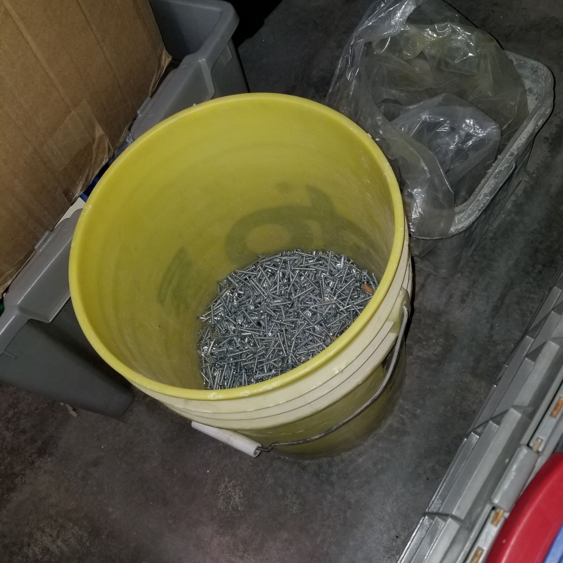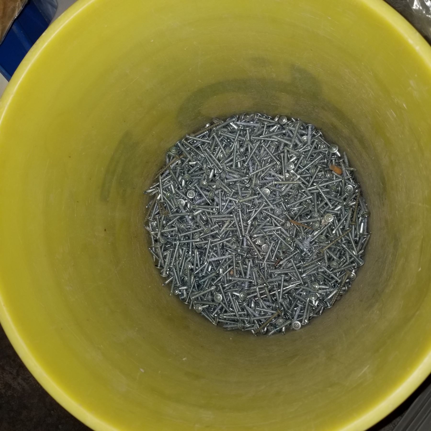 YELLOW AND WHITE BUCKET OF SCREWS