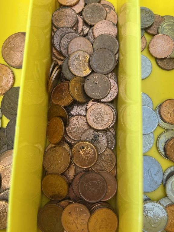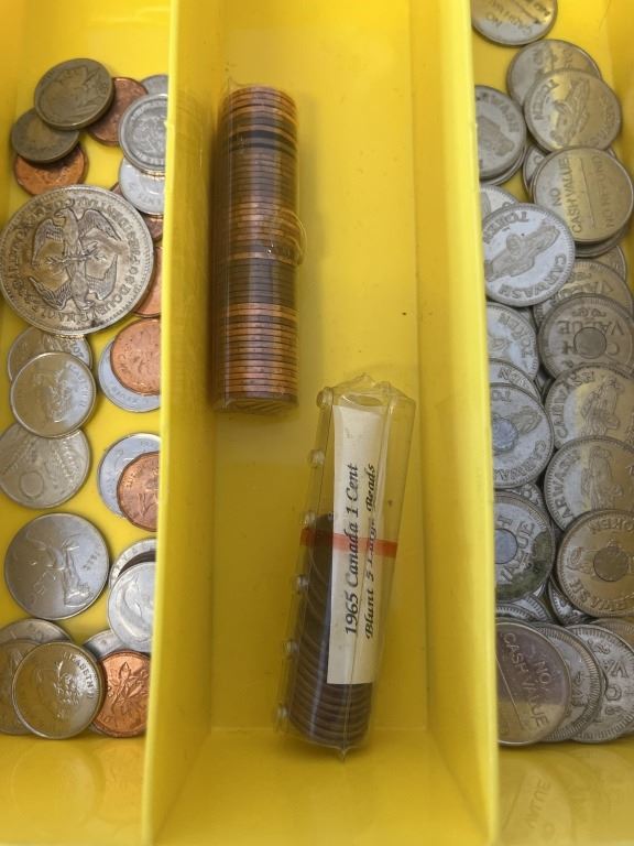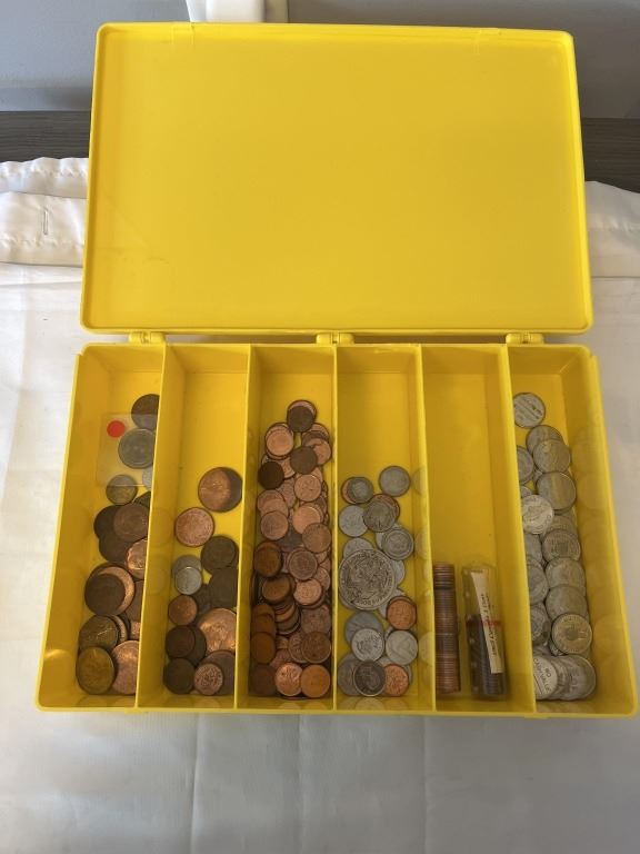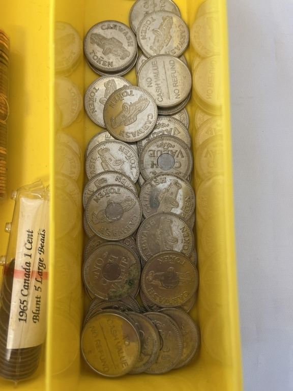YELLOW CASE WITH ASSORTED COINS AND TOKENS