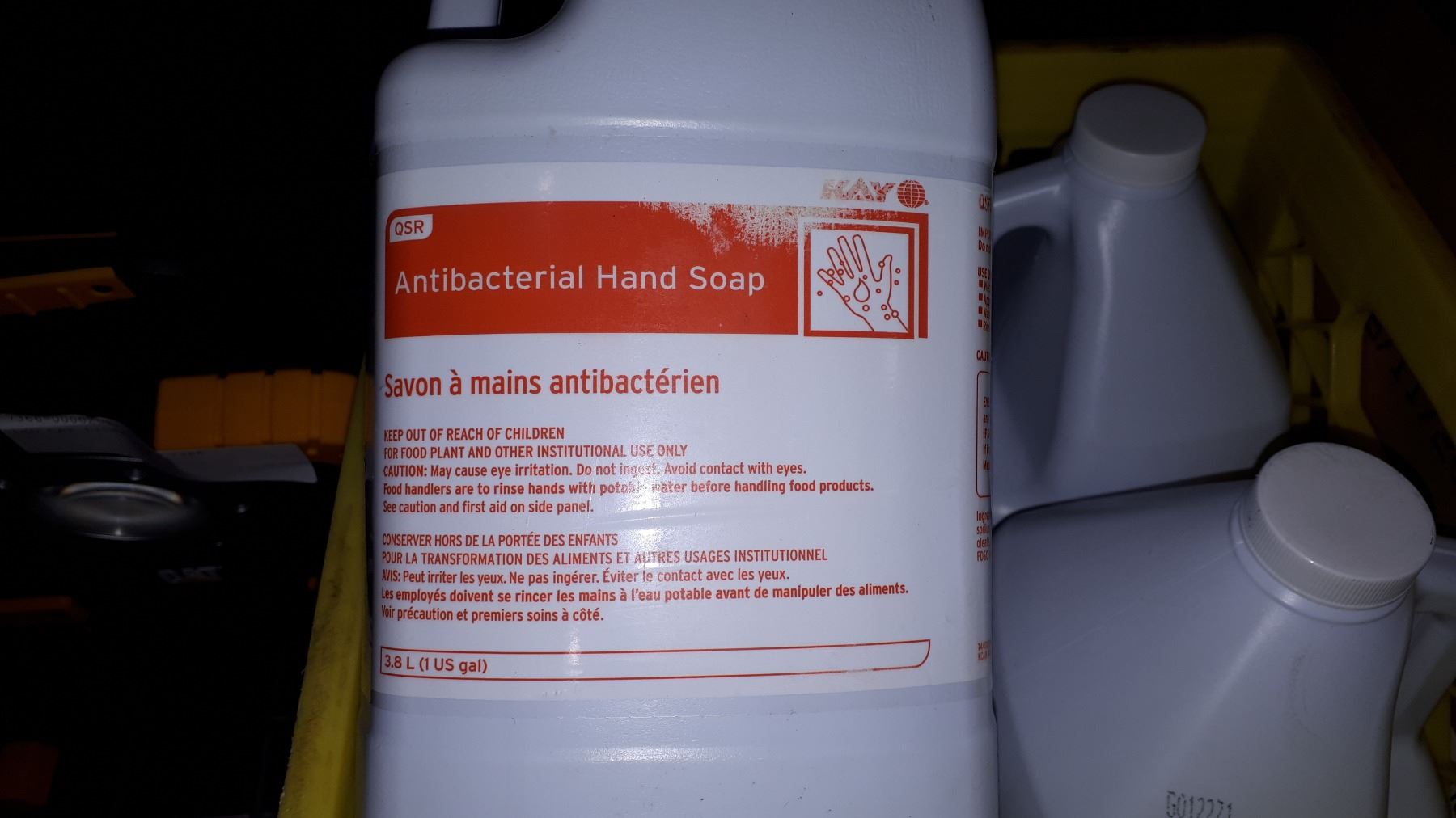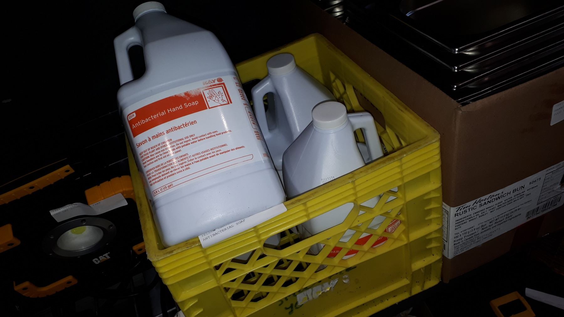 YELLOW CRATE OF 4 BOTTLES OF ANTIBACTERIAL SOAP