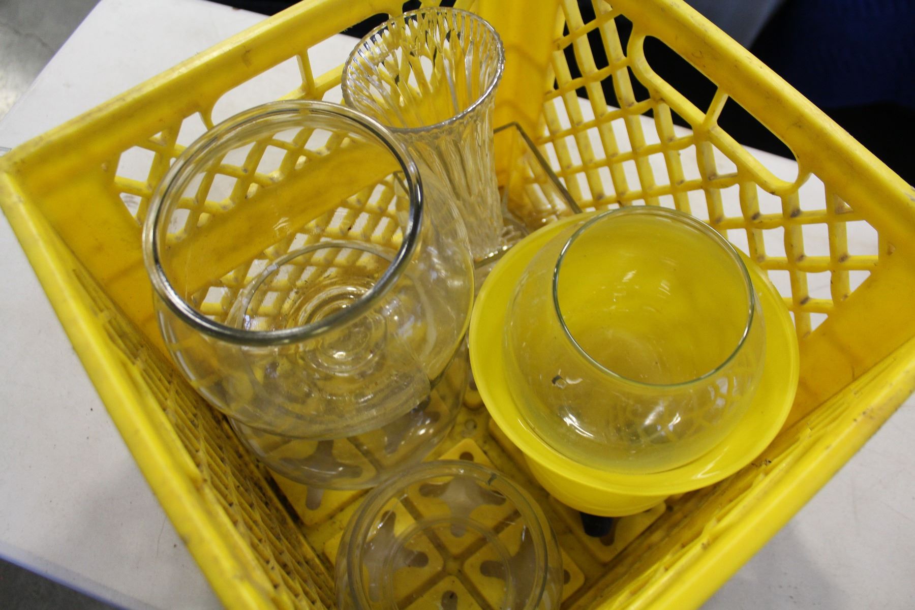YELLOW CRATE OF GLASSWARE