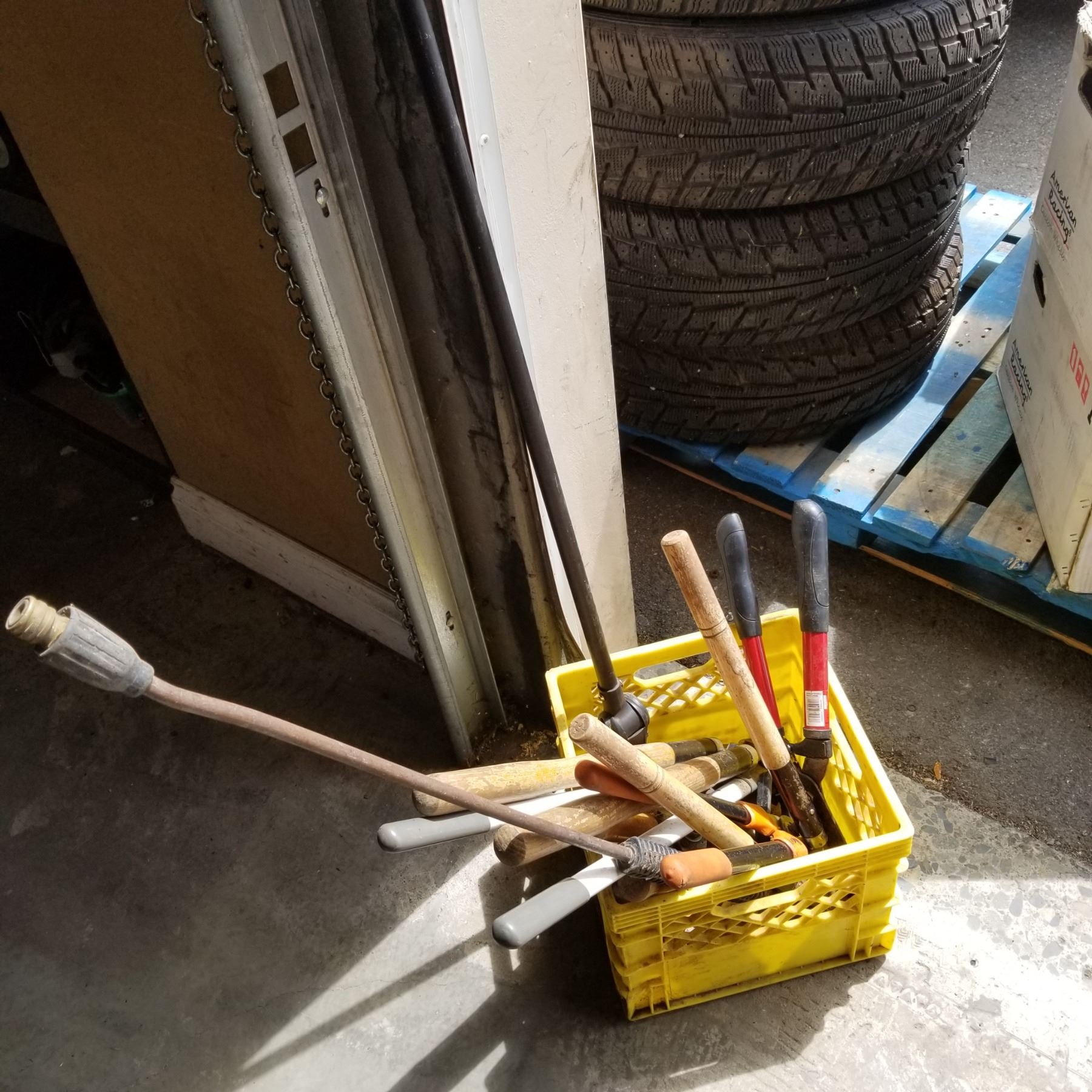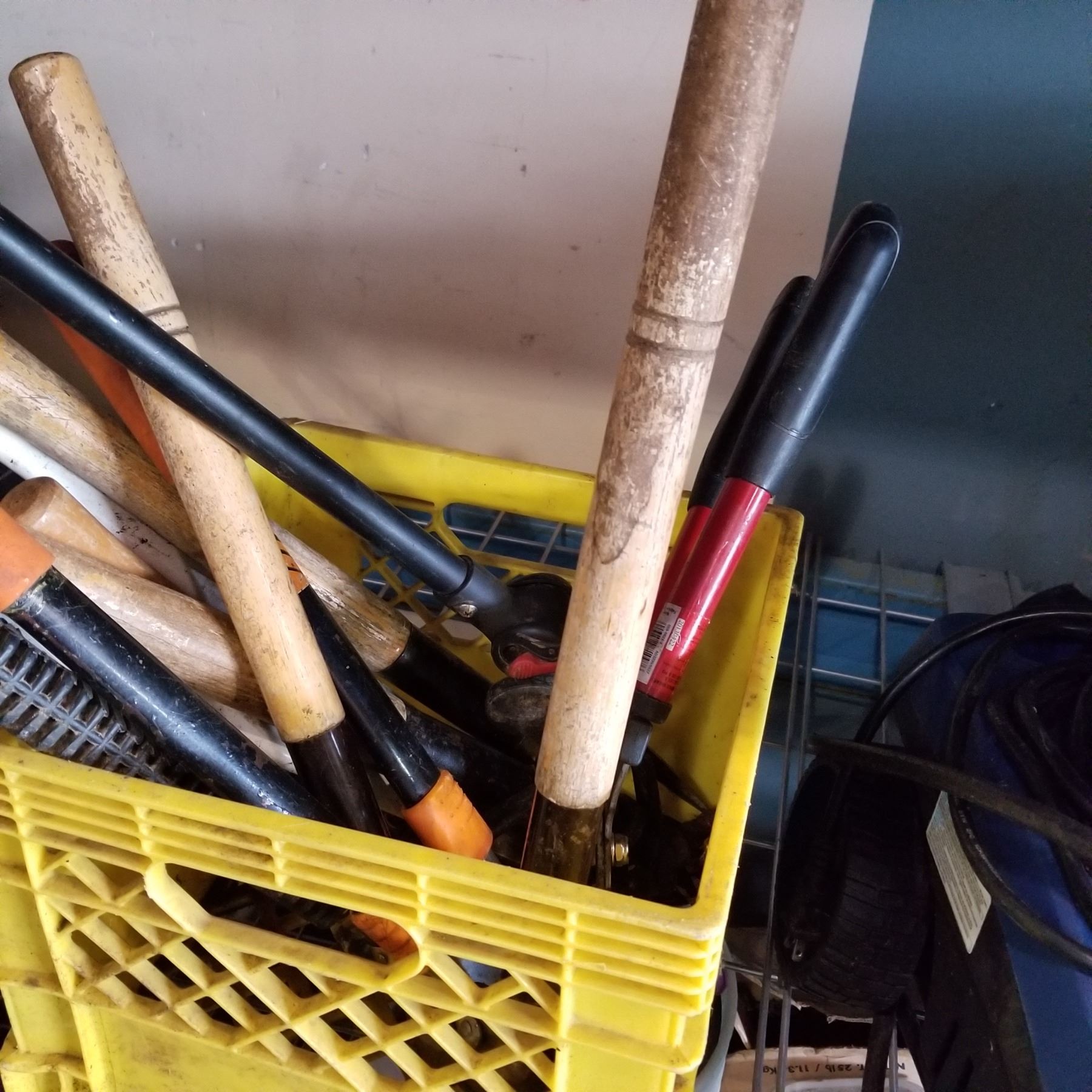 YELLOW CRATE OF PRUNERS AND GARDEN TOOLS