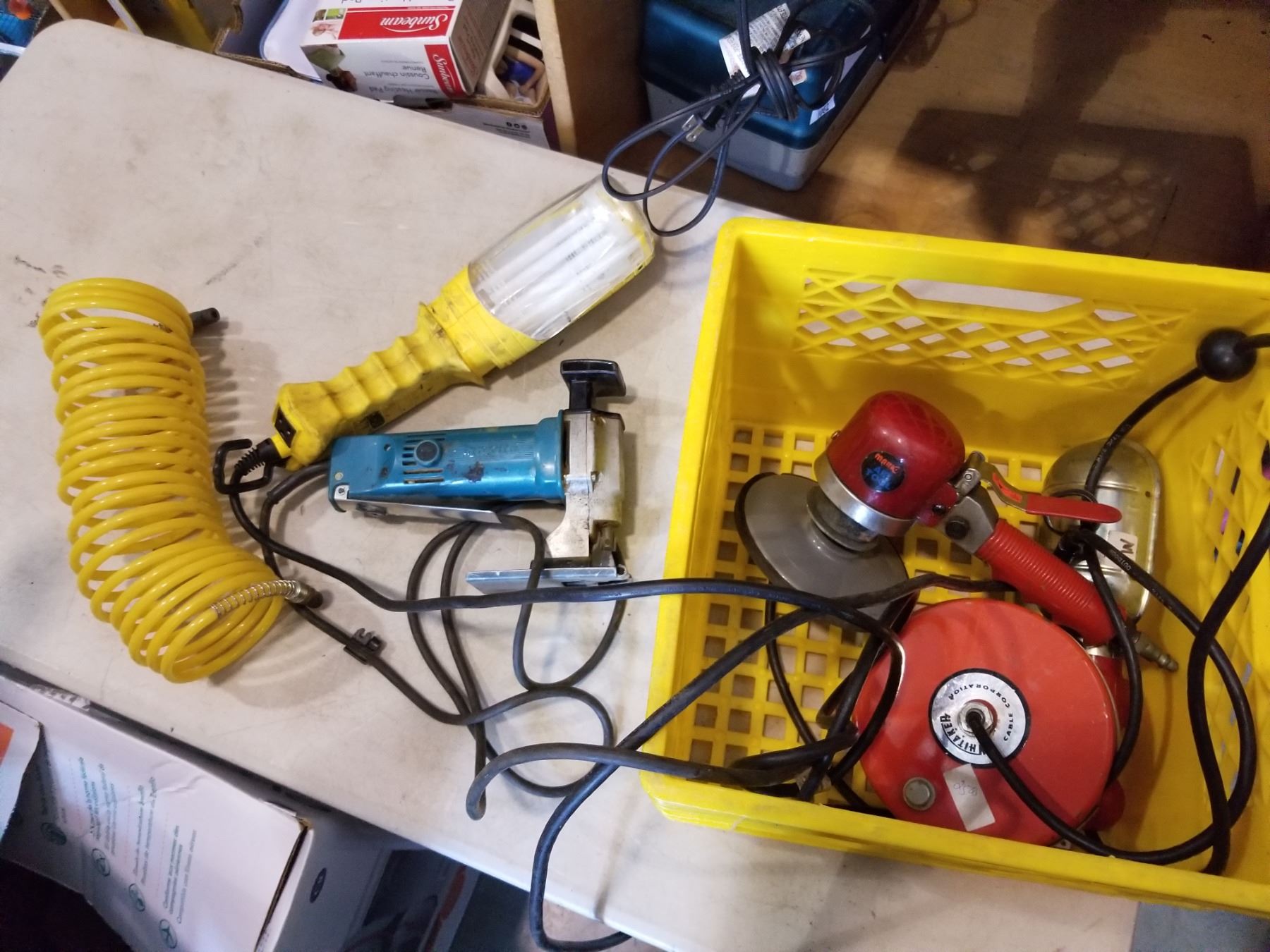 YELLOW CRATE W/ MAKITA SAWZALL, TROUBLE LIGHTS, AIR GRINDER