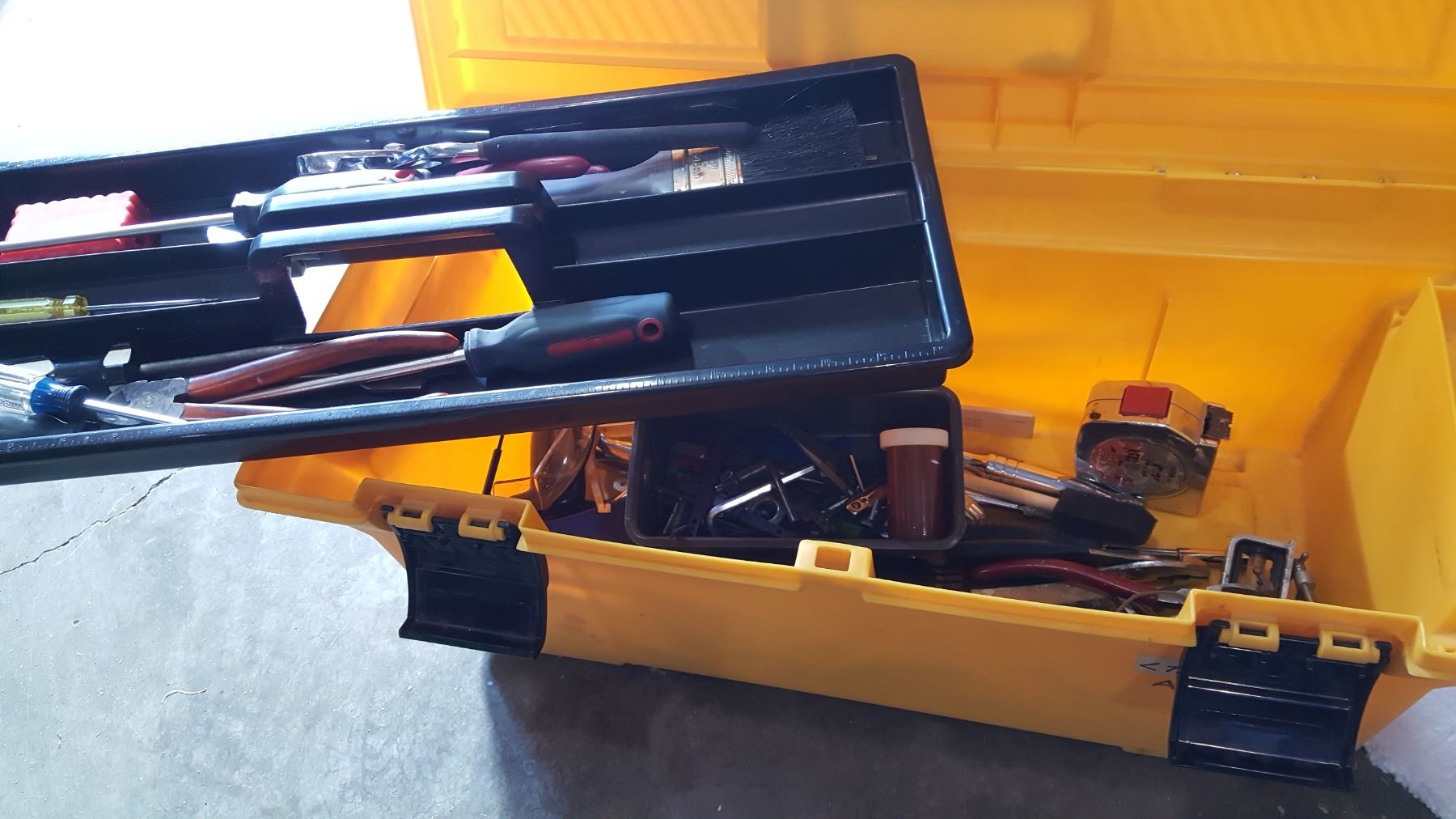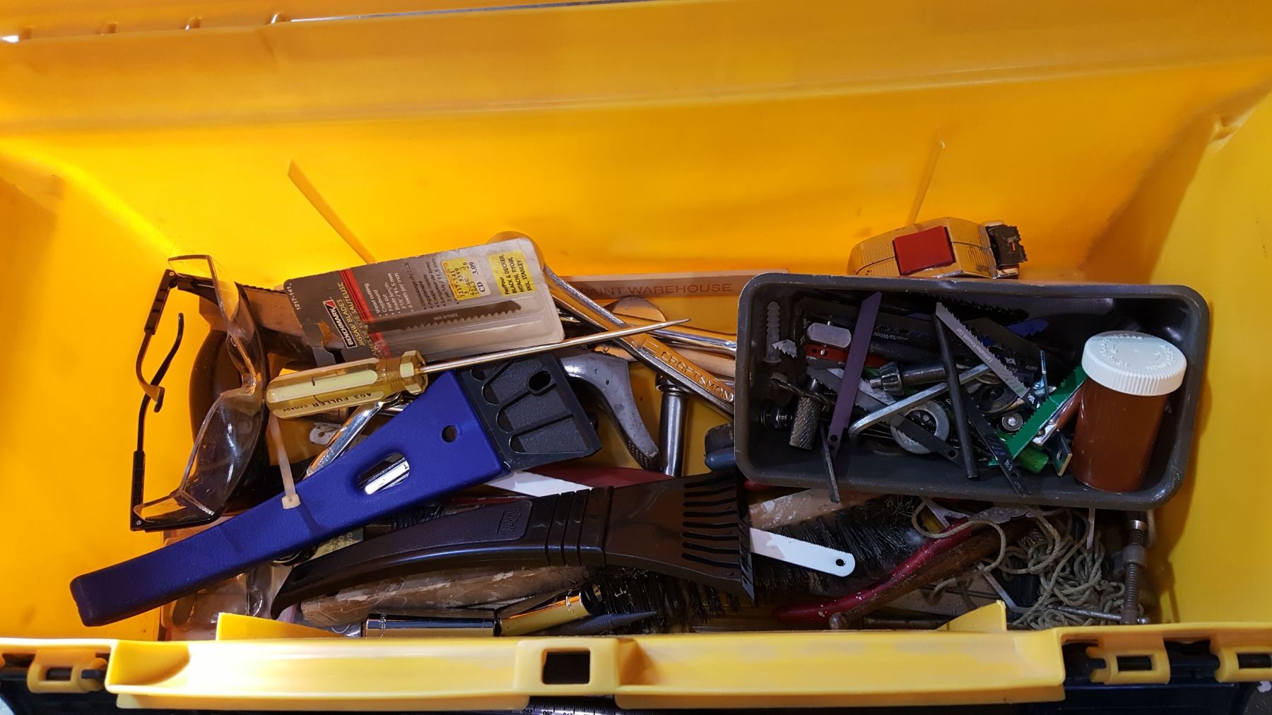 YELLOW RUBBERMAID TOOL BOX W/ CONTENTS
