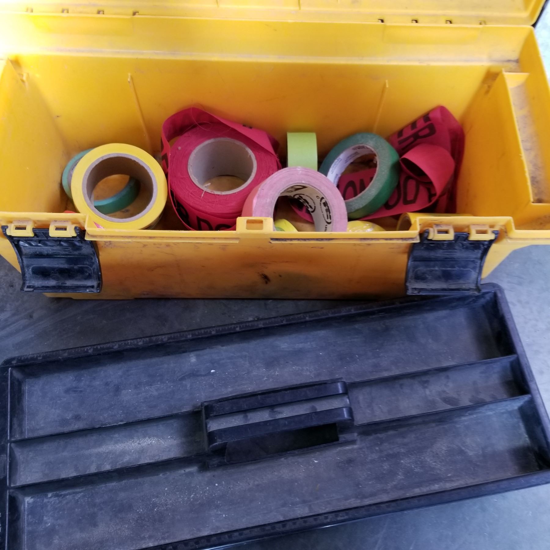 YELLOW RUBBERMAID TWO TRAY TOOLBOX WITH TAPE CONTENTS