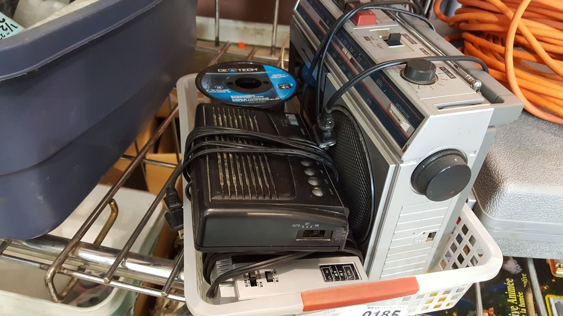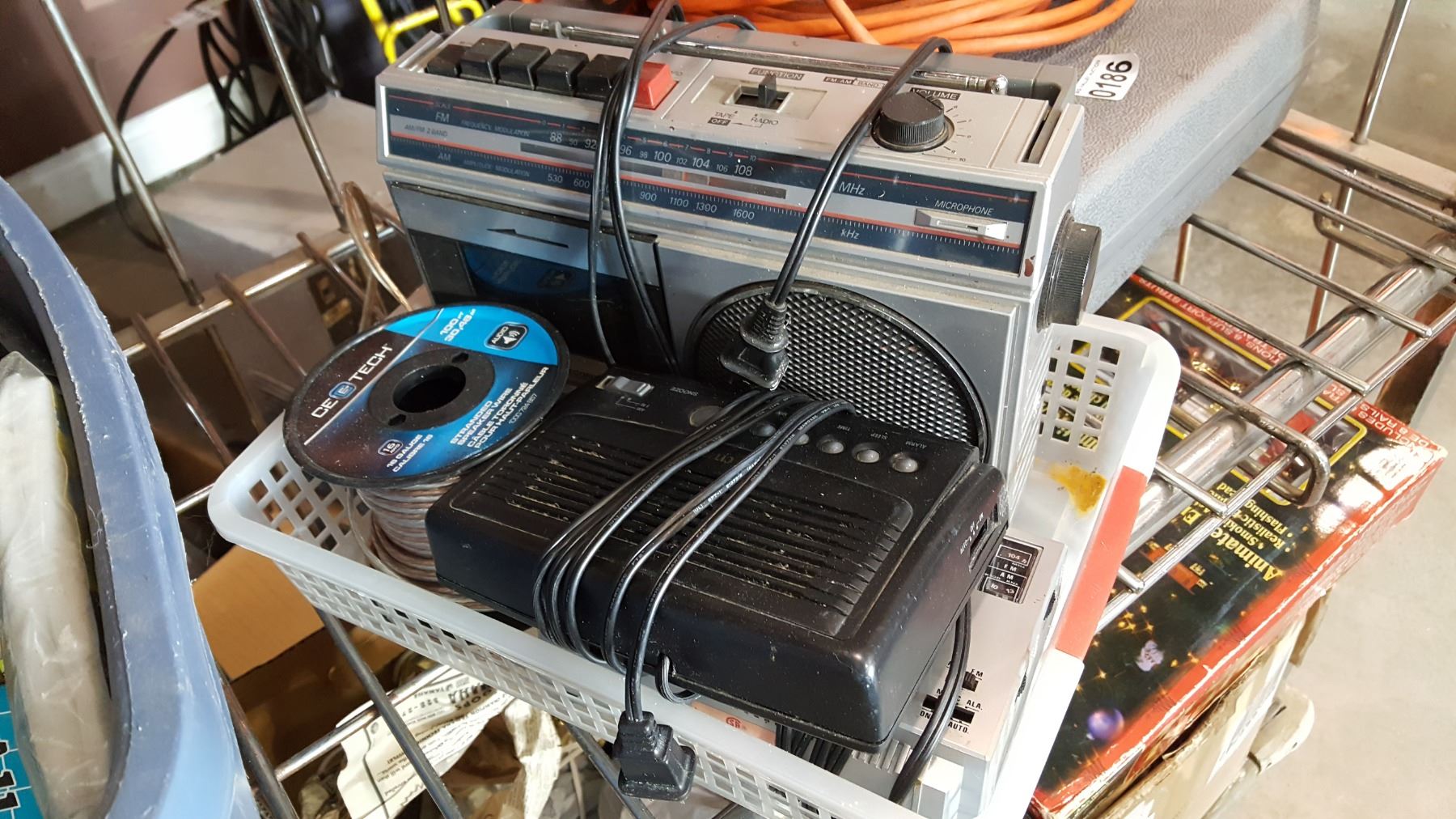 VINTAGE RADIOS, CLOCK, AND SPOOL OF ELECTRICAL WIRE