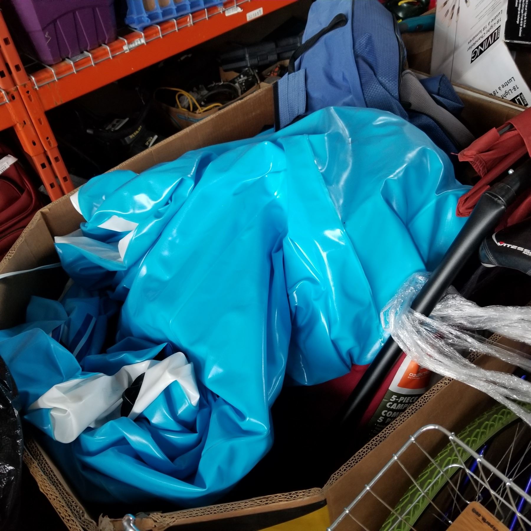PALLET OF RETURNED INFLATEABLES, CAMP GEAR, UMBRELLA