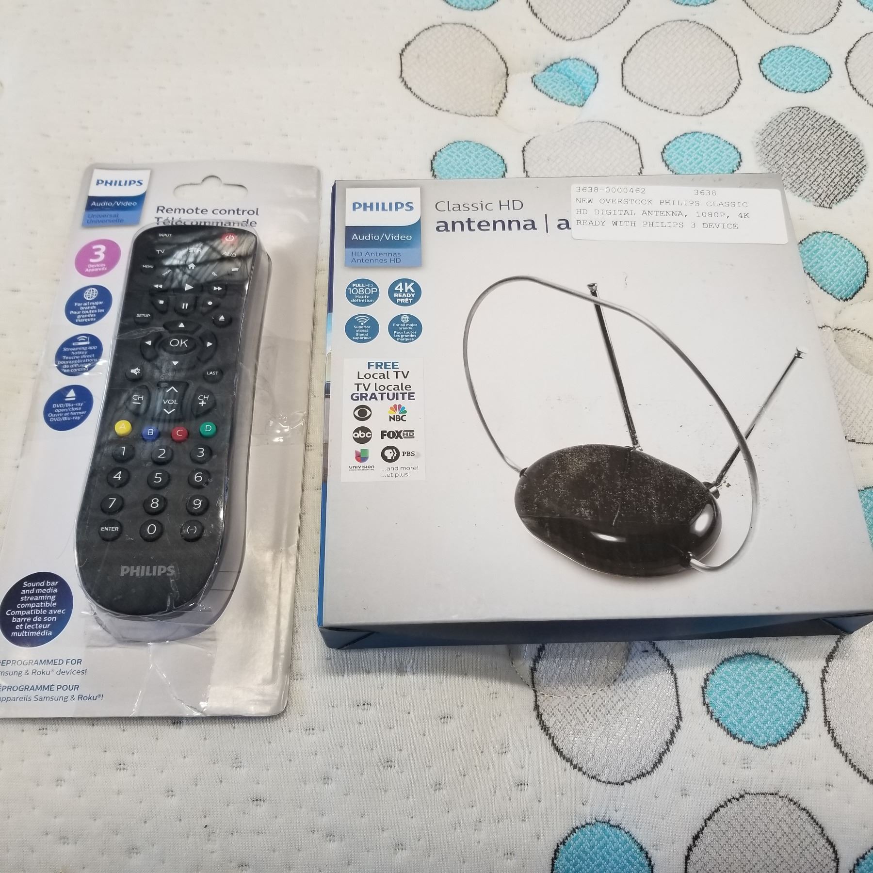 NEW OVERSTOCK PHILIPS CLASSIC HD DIGITAL ANTENNA, 1080P, 4K READY WITH PHILIPS 3 DEVICE UNIVERSAL REMOTE