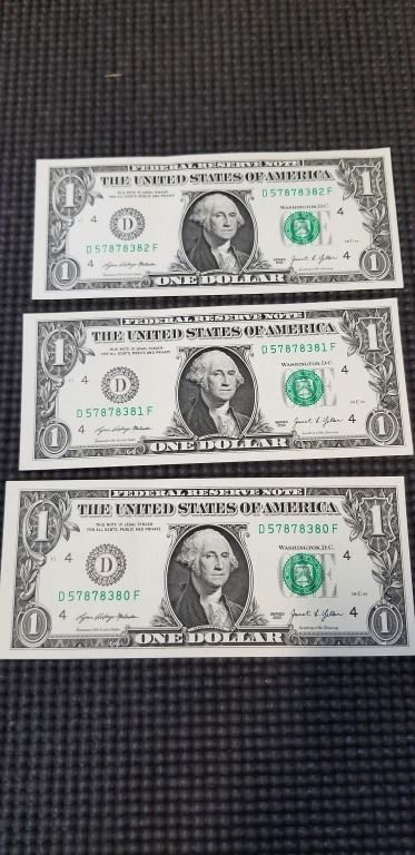 3 UNCIRCULATED US DOLLAR BILLS CONSECUTIVE SERIAL NUMBERS OHIO SERIES